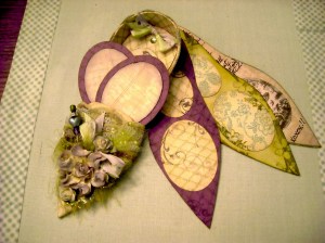 The photo to the side here is a Victorian Shoe Mini Album.  There are two inserts for the toe of the shoe that have photo mats on each side.  There are 5 other photo mats and one journaling spot as well.  It is a very sturdy piece made with papers, stamps, ribbons, mulberry paper flowers, beads, pearls, fibers, netting and a jeweled stick pin.  Very lavish and elegant.