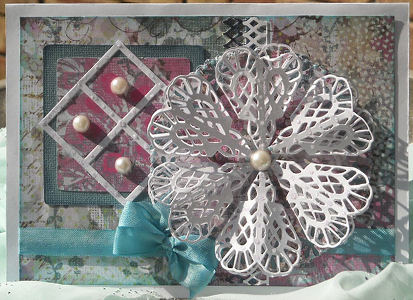 The other die makes a cut that looks like a 20-light window frame.  I cut out a piece with four squares to use on this card.  My paper is from one of my all time favorite stacks, K&Co. Jubilee and the unpatterned piece is Bazzill.  I used pearls from Reflections and Crystal Stickles.  The ribbon is Hug Snug seam binding which I hand-died with Distress Ink in Tumbled Glass.  (I really love this 100% rayon seam binding; It drapes so beautifully…)  I also used the Distress Ink in Tumbled Glass and Chipped Sapphire around the edges of my papers.  I used plain white cardstock from Reflections for my 7 1/2 inch x 5 1/2 inch card and all of my die cuts.