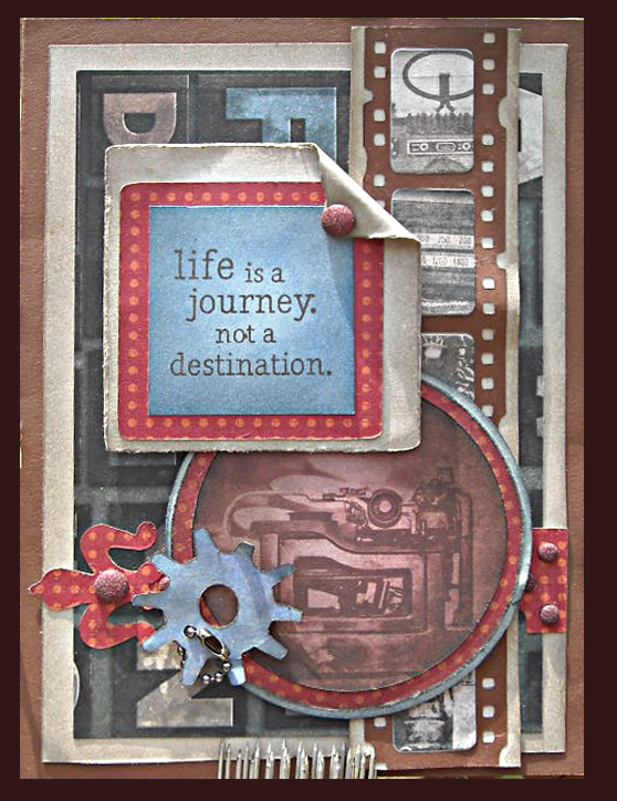 I used almost exclusively Tim Holtz/Ranger products, scraps from old projects and the Michael’s $1.00 bin stamp. Please excuse the flower frog at the bottom that I used to keep the card steady in the wind!