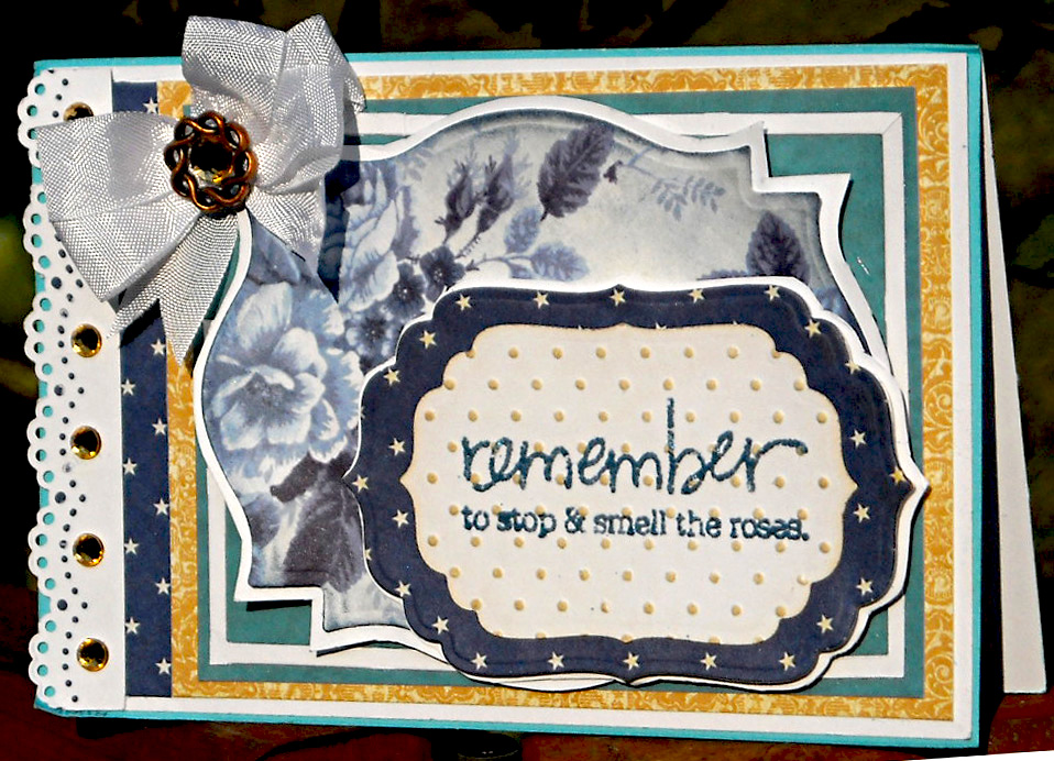 Here is the card I created for The Play Date Cafe challenge this week.  The color scheme for the challenge utilizes one of my all time favorite colors: dark blue.  See the challenge photo as follows: