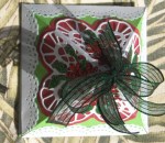 The box is approximately 3 inches by 3 inches at the base and about 2 inches tall.   There are multi-layers of card stock and finely hand-crafted paper lace doily pieces along with glitter paper leaves and flowers near the top bow.  It, too, is going in my Etsy Shop and can be customized with the color combo of ones choice for their holiday decor.  If you prefer, you can convo me through this website in the comments section.