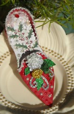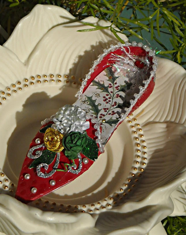While my sister was visiting with me, she worked tirelessly on this tiny version of the Victorian Shoe hoping it would be appropriate as a Christmas Tree ornament. I think her instincts were right!