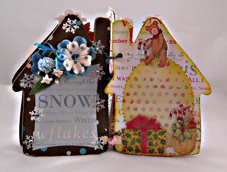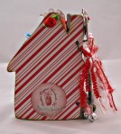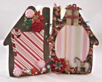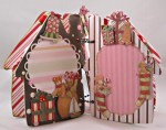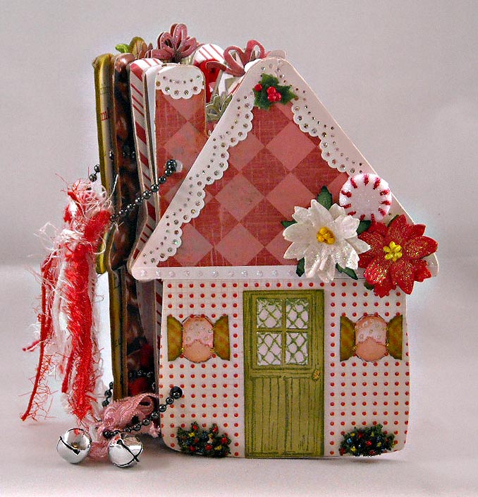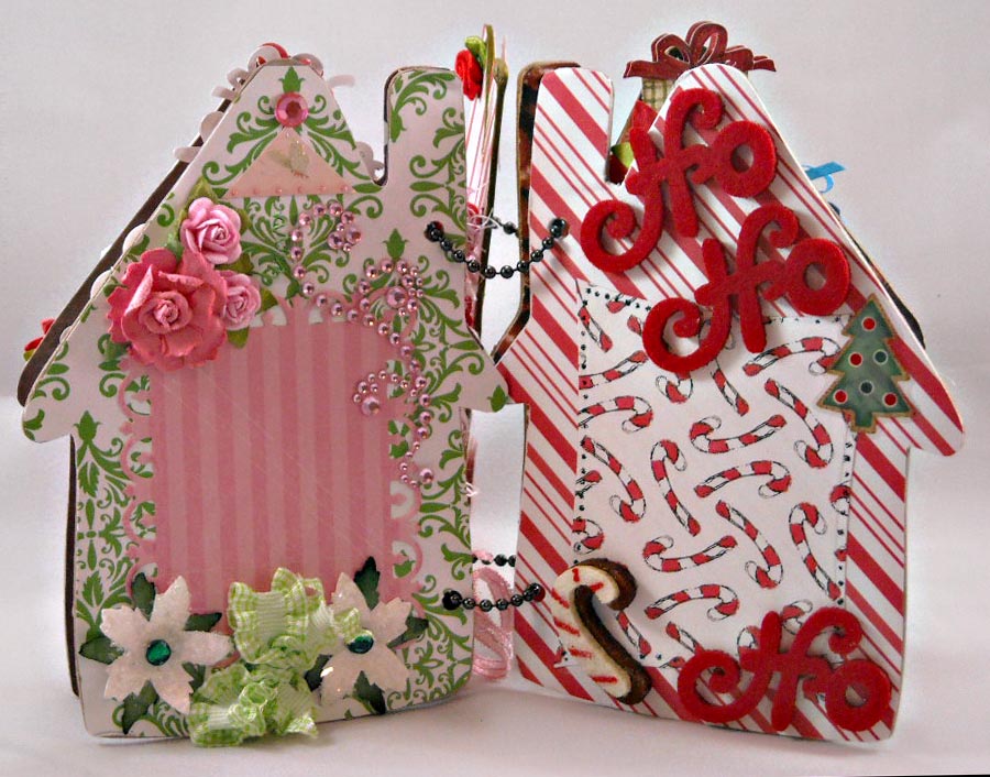 Candy Land, here we come! Only this one has no calories… just adorable spots for photos of the family at Christmas, or as a sweet gift for someone else. This album is approximately 4 1/2 inches from roof tip to roof tip and 6 inches high. It is constructed of chipboard (or heavy cardboard to the non-paper crafters out there) and then overlaid with an assortment of crafting papers and embellishments. Here are views of the pages within: