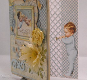 I made this card with the new Graphic 45 Little Darlings Collection (both background papers and fussy cut pieces); Spellbinder’s Dies; Recollections flowers (plus one from my stash of floral picks); Martha Stewart leaf punch, Stickles and Distress Inks.