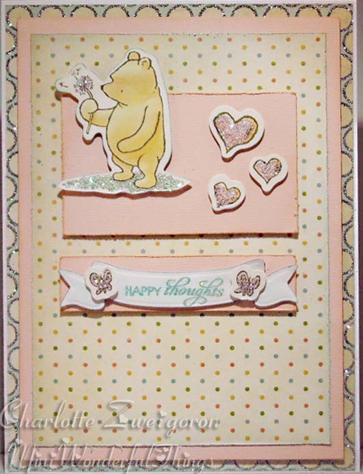 In this case, I followed the sketch but I did add a few little extras.  Well, it is definitely CAS for ME!  I don’t know about anyone else…  Paper: Lost & Found, Graphic 45 Little Darlings.  Ink: Ranger Distress Ink, Momento Ink.  Tools: Viva La Verve stamp, Spellbinders die, Recollections cutting tool, Tim Holtz distresser.  Embellishment: Disney Winnie the Pooh cardstock cutouts.