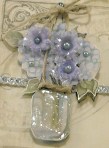 I also wanted you to see what “fussy cutting” is. There is a jar of flowers on the original paper. I took that little section from another piece of that paper, glued it to something a little sturdier and cut around the jar and flowers as close as possible to the edge. Sometimes, one just layers this onto the card stock (as I did in Cait’s Birthday card) or, as in this case, I used foam pieces called “dimensionals” to raise the piece above but right over the print on the original paper. Thus giving dimension to the object. I added the string that the jar hangs from, used the Glossy Accents on the jar and added my own little flowers and pearls to the bunch of blooms.