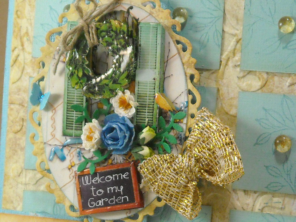 Wow, this is so beautiful! Especially love the little chalk board and shutters. You used that burlap ribbon on my birthday card. I love it! Great job!