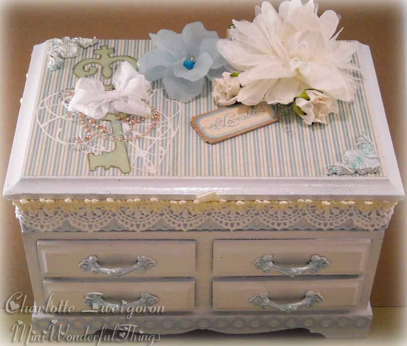 I got the music box at the thrift store and my DH spray painted it white for me.  I had considered doing a crackle finish or something like that but I really love a crisp white background.  And her daughter had told me that her bedroom colors in the new house are beige, cream and blue.  I happen to know there is a lot of white wood in that room so those are the colors I went with on the outside.  The inside lid is an array of different flowers and photos that add other pastels to the mix.