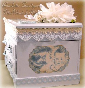 As I mentioned, I used the Little Darlings 12 inch x 12 inch paper collection and the matching Cardstock Cutouts; Recollections Photo Corners; flowers from Recollections, Jolee, I Am Roses and Wild Orchid Crafts; dies from Memory Box, Sizzix and Spellbinders, Recollections and Prima bling; Distress Ink and a gold edging pen; lace from Hobby Lobby and a gift from Sabrina of http://sjbutterflydreams.blogspot.com; the bow was made from rayon seam binding and the handles were painted with metalic blue craft paint.  I believe DH spray painted the box with Krylon glossy white.