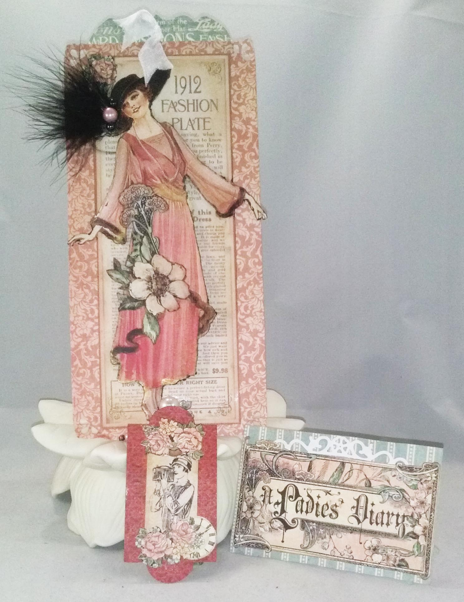 Almost everything is from the A Ladies Diary collection, including the fussy cut bits; one of the beauties of Graphic 45 paper pads.  The jewels and feather were from my stash, probably Hobby Lobby purchases, and the marvelously appropriate poem is an epoxy sticker from Cloud 9 Design.  I feathered over each paper piece with Tim Holtz Distress Ink and made the loop and bow with seam binding.