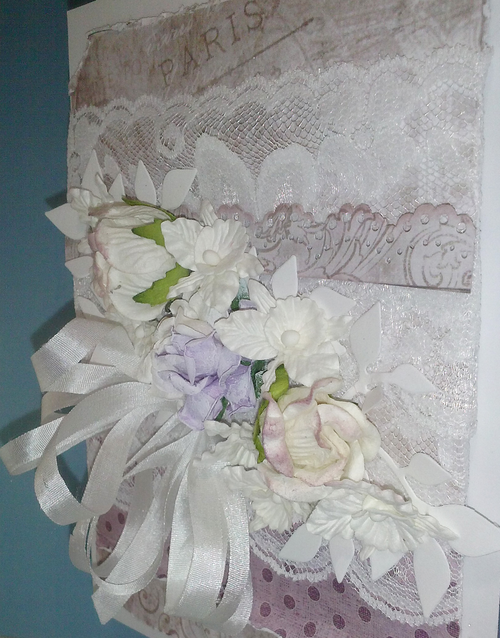 The flowers are probably from Wild Orchid but I have had them a long time; lately, I much prefer to make my own paper flowers.  It seems to be something I am drawn to do and love to do.  I did use inks on these flowers to give them the vintage lavender look I wanted.