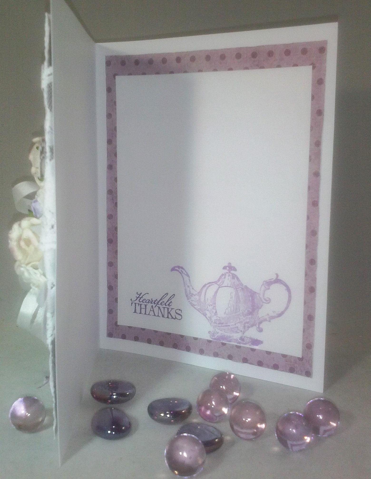 Beautiful and dreamy card….beautiful flowers ribbons and design!!! Thank you for joining us at “The Shabby Tea Room” for our “Lavender and Lace” challenge!!!